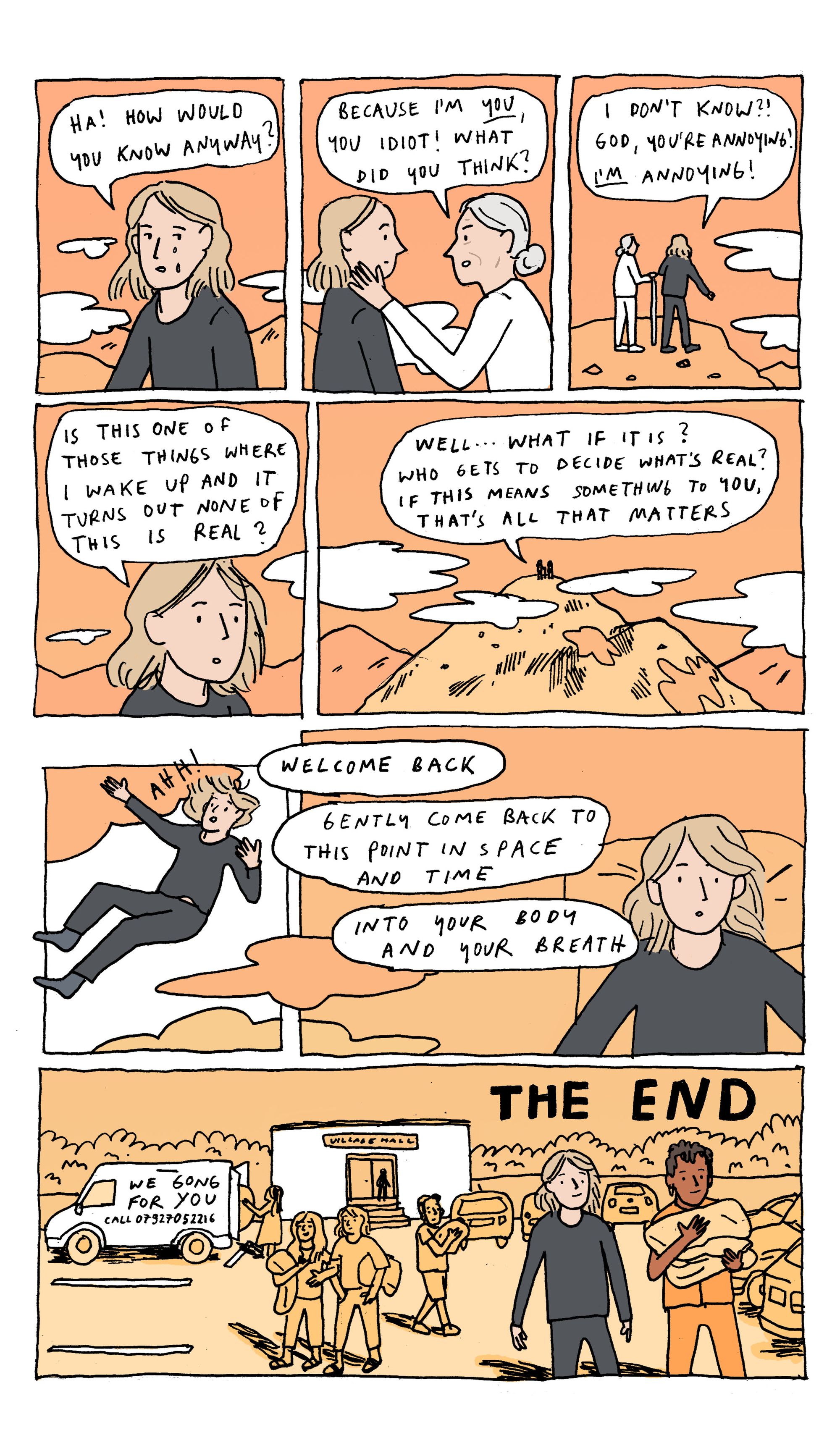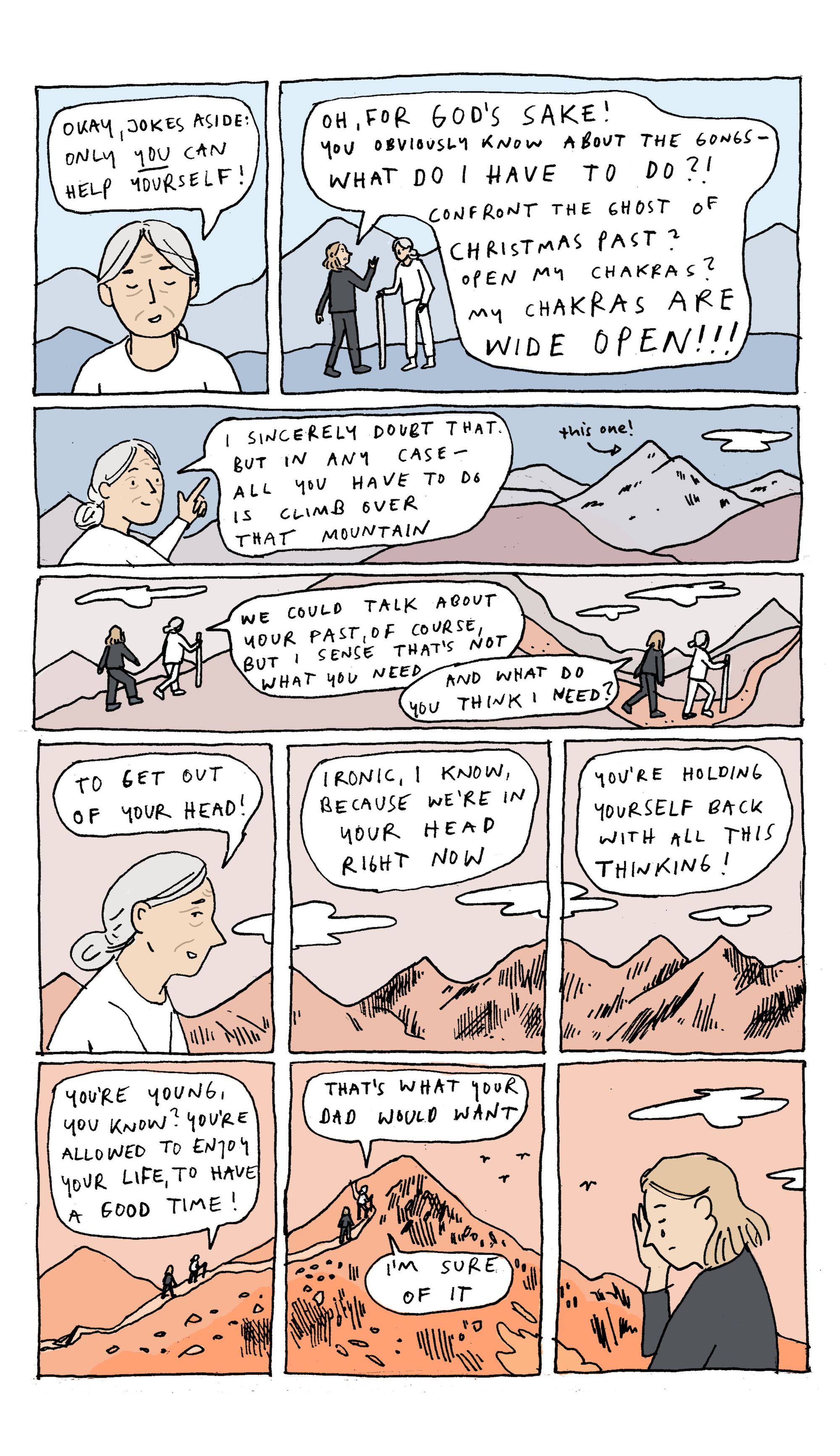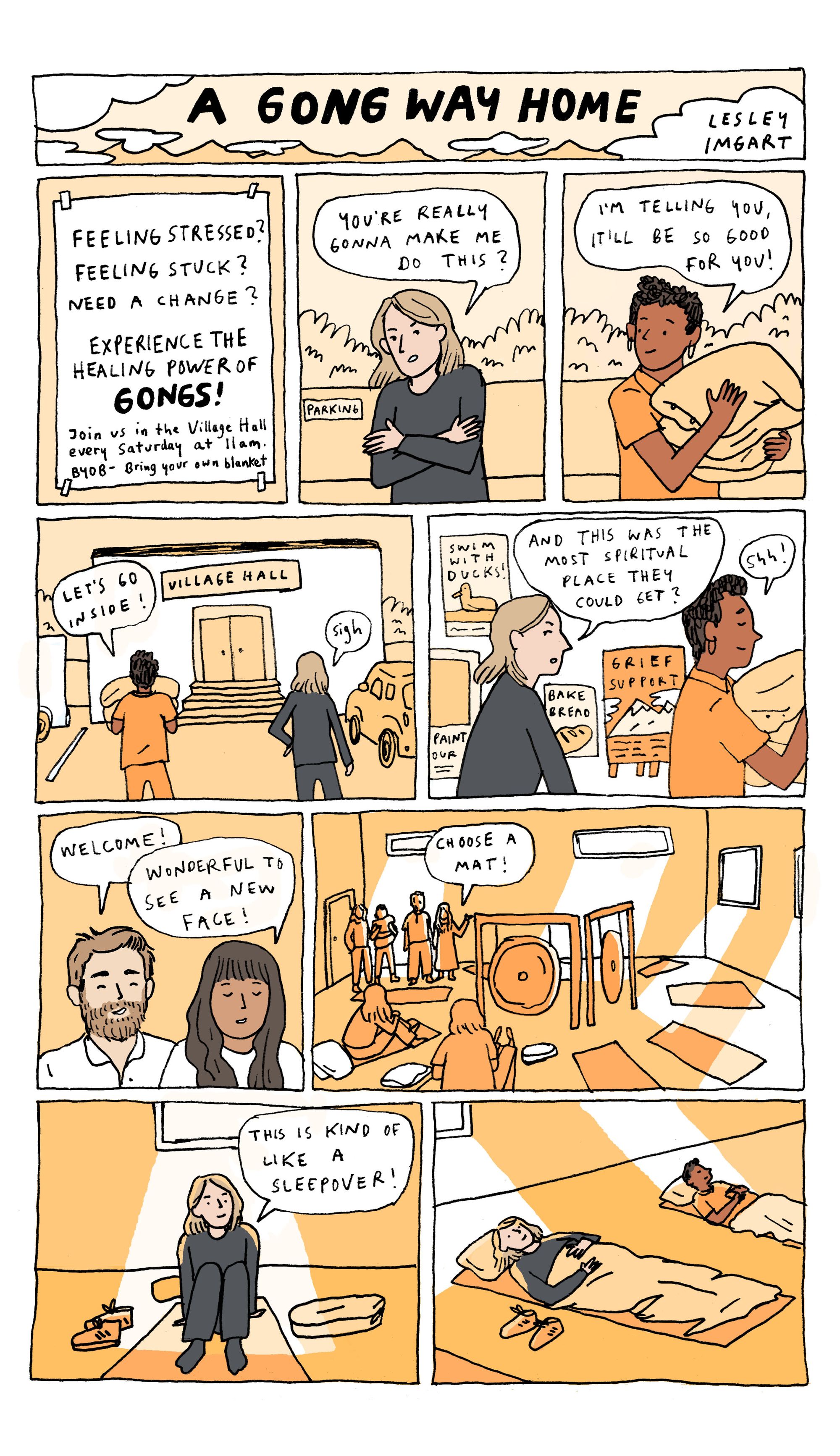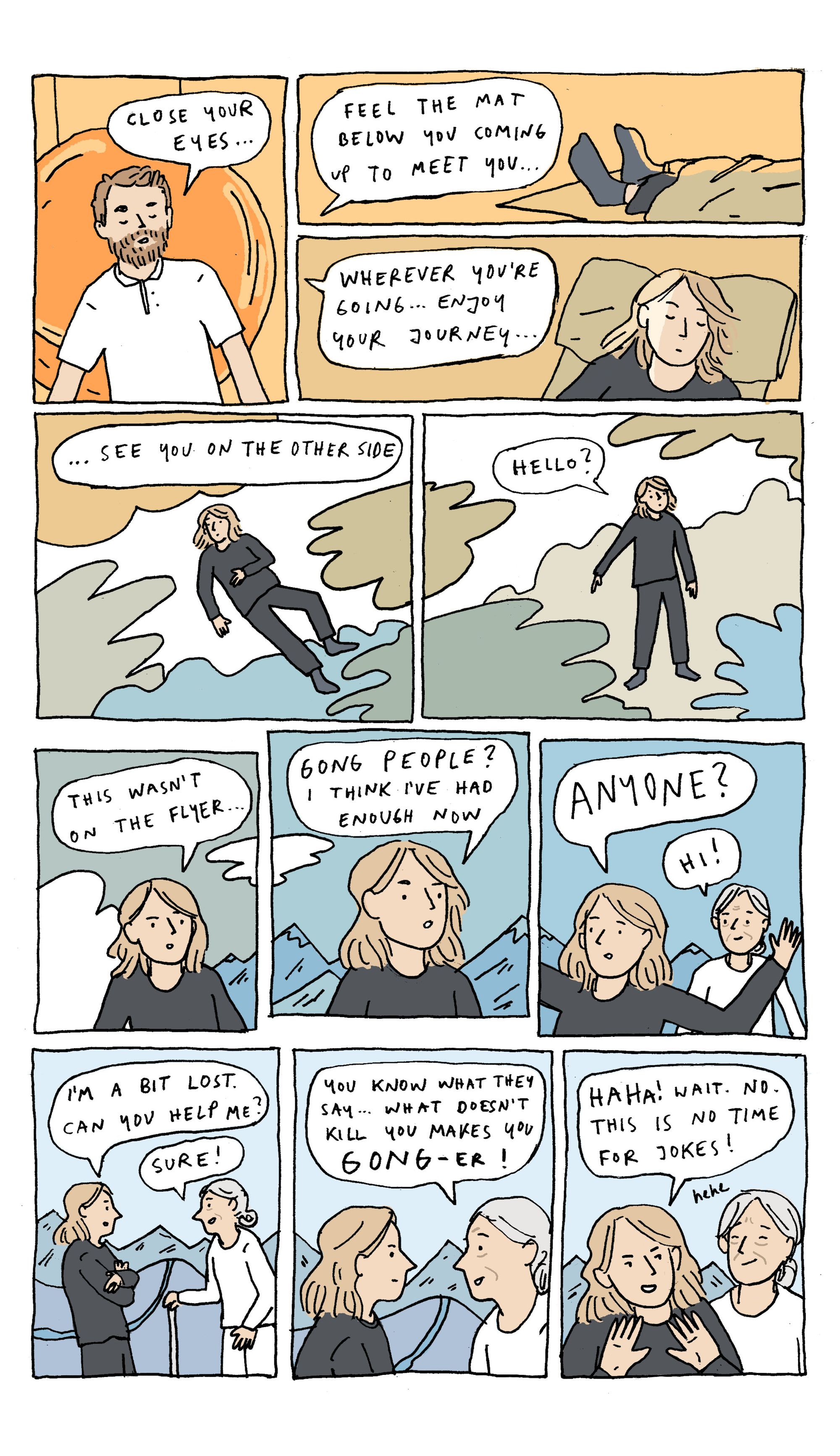I was extremely fascinated by the way that all these adults congregated like they were at a sleepover, carrying in pillows and blankets solemnly. The fact that this was a group activity, with people's mats arranged around the gongs in the middle, yet everyone was having individual, separate experiences. The way that we all came together and then broke apart again. There is something about that experience that is naturally like a story - beginning, middle and end. That's reflected in the colours, which end in the same place they started, but our main character is not the same.