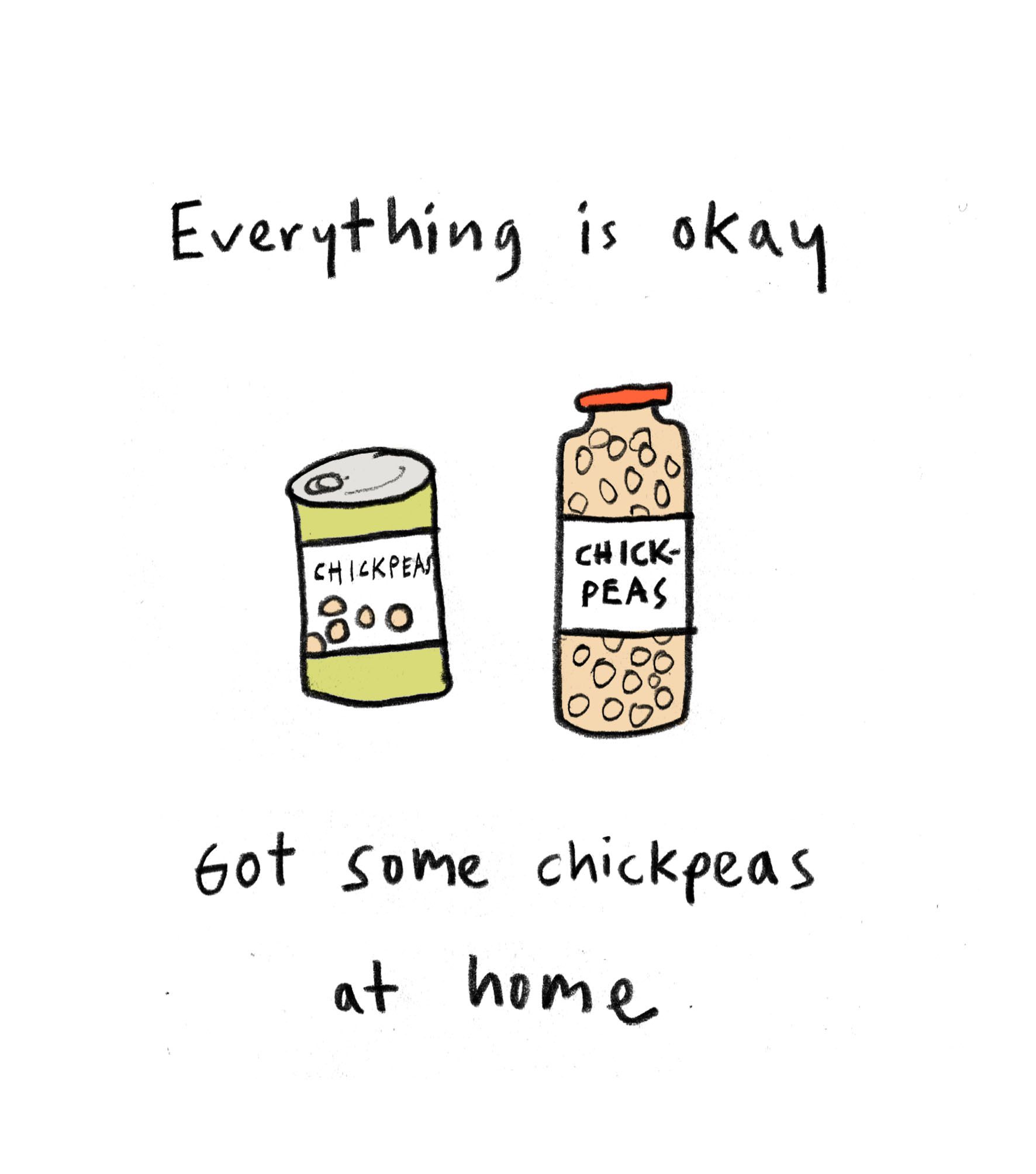 The other day I thought to myself: "There is a tin of chickpeas in the cupboard and that means everything is okay". What I mean by this is that the tin of chickpeas could become lunch or dinner or even a snack, today or on a day in the future (tins of chickpeas never get to see many days of future in our kitchen, it's a position with a high turnover). The tin of chickpeas and its inherent possibilities reassure me and make me feel safe - I can go about my day in peace knowing it's there, waiting for me.